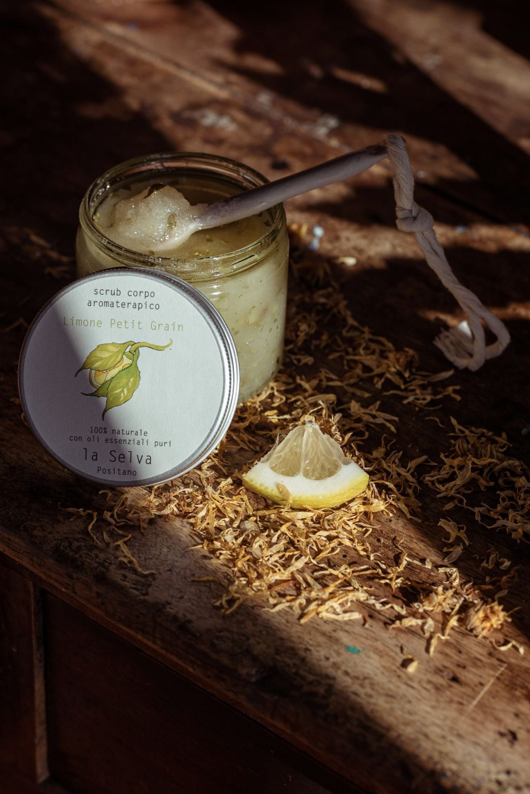 Ingredienti: sale integrale marino integrale, olio di mandorla, olio di albicocca, tocoferolo (vitamina E ), scorzette di buccia di limone e foglie sminuzzate di limone, oli essenziali puri di limone, petigrain e geranio rosa.